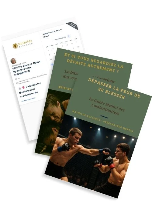 Le mental fait toute la différence quand la pression monte et quand l'enjeu est important. Recevez 2 ebooks essentiels pour mieux comprendre vos peurs et retrouver une posture plus juste dans le combat. Vous recevez : • Dépasser la peur de se blesser • Et si vous regardiez la défaite autrement ? Bonus Un appel découverte offert Un échange pour faire le point sur votre mental et voir si un accompagnement peut vous aider.